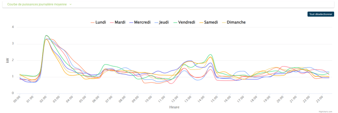 Une courbe de puissance moyenne par jour est également disponible. Elle permet de visualiser un profil type de consommation journalière, utile pour comparer plusieurs jours de la semaine ou anticiper les périodes critiques.
