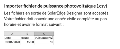 Importer un fichier CSV : si vous disposez de vos propres données (issues de PVSyst, de mesures réelles ou d’une étude), vous pouvez les importer pour que le logiciel les prenne en compte directement.