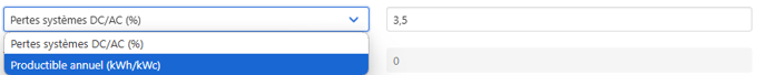 Forcer une valeur fixe : dans la configuration avancée du photovoltaïque, vous pouvez changer les pertes systèmes DC/AC contre une valeur de productible annuel (kWh/kWc).