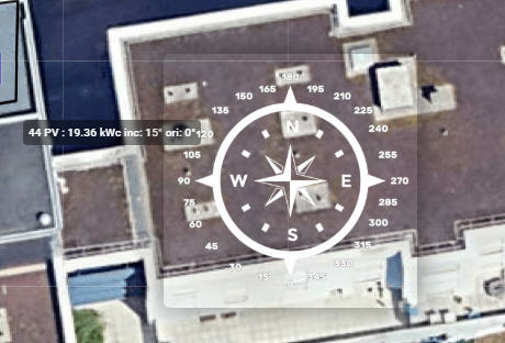 Pour vous aider à régler correctement l’orientation, une boussole est affichée sur la carte. Celle-ci peut être agrandie afin de mieux visualiser les axes géographiques et orienter les modules de manière précise lors du calepinage.