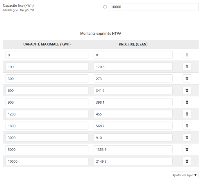 Il est également possible d’ajouter des lignes personnalisées avec d’autres niveaux de capacité ou de prix grâce au bouton “Ajouter une ligne”.
