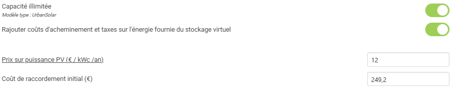 Le Prix sur puissance PV (€ / kWc /an) et le Coût de raccordement initial (€) sont préremplis par défaut mais peuvent être modifiés selon l’offre.