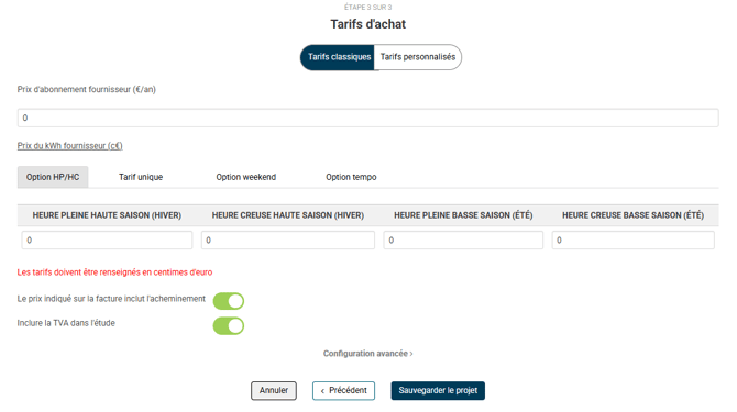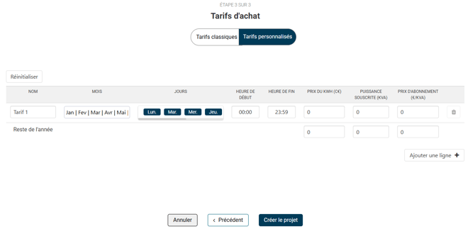 La dernière étape de paramétrage d’un projet dans Optiwize Pro consiste à renseigner les tarifs d’achat d’électricité. Ces données sont essentielles pour évaluer la rentabilité du projet, les coûts d’approvisionnement et les économies potentielles.