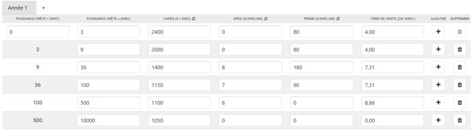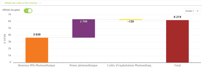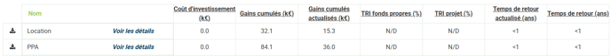 Pour un scénario en PPA : les revenus du PPA, les cout d'OPEX, la prime etc...